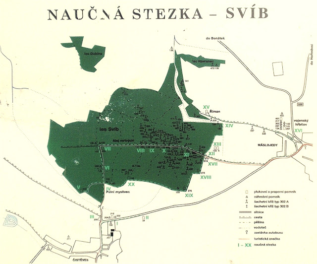 Tabule s mapou označující pozice pomníků a křížů uvnitř lesa Svíbu a v jeho okolí.